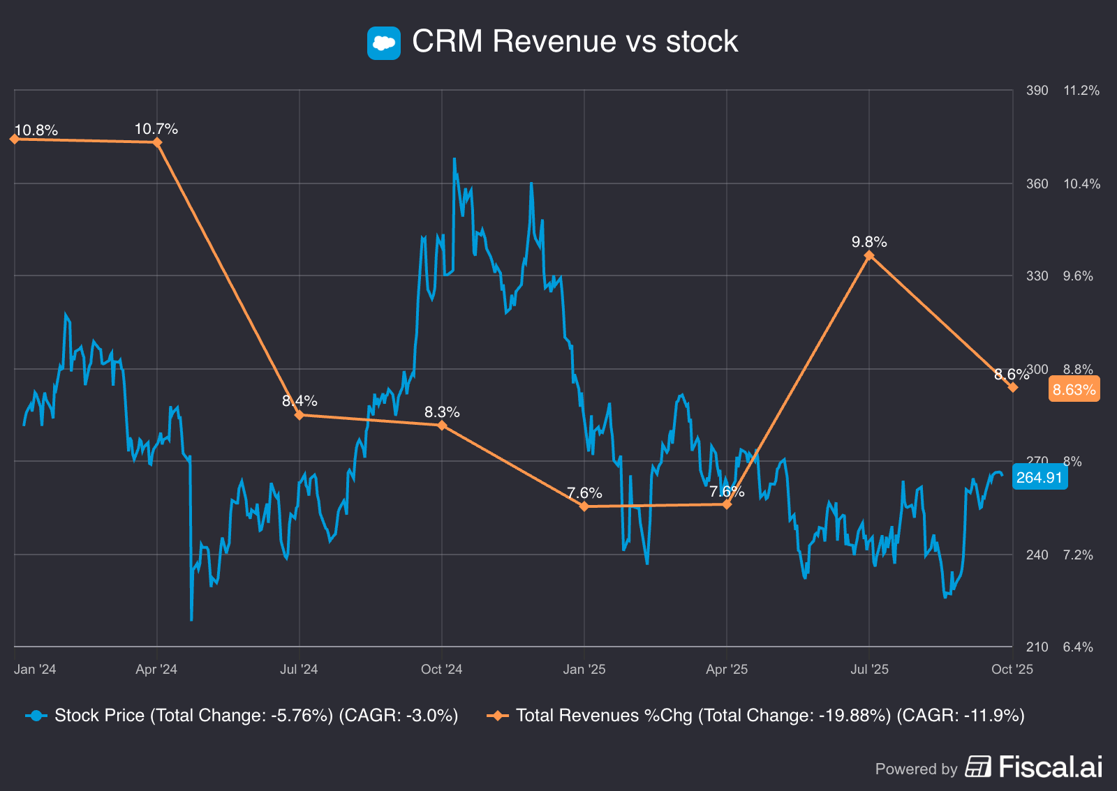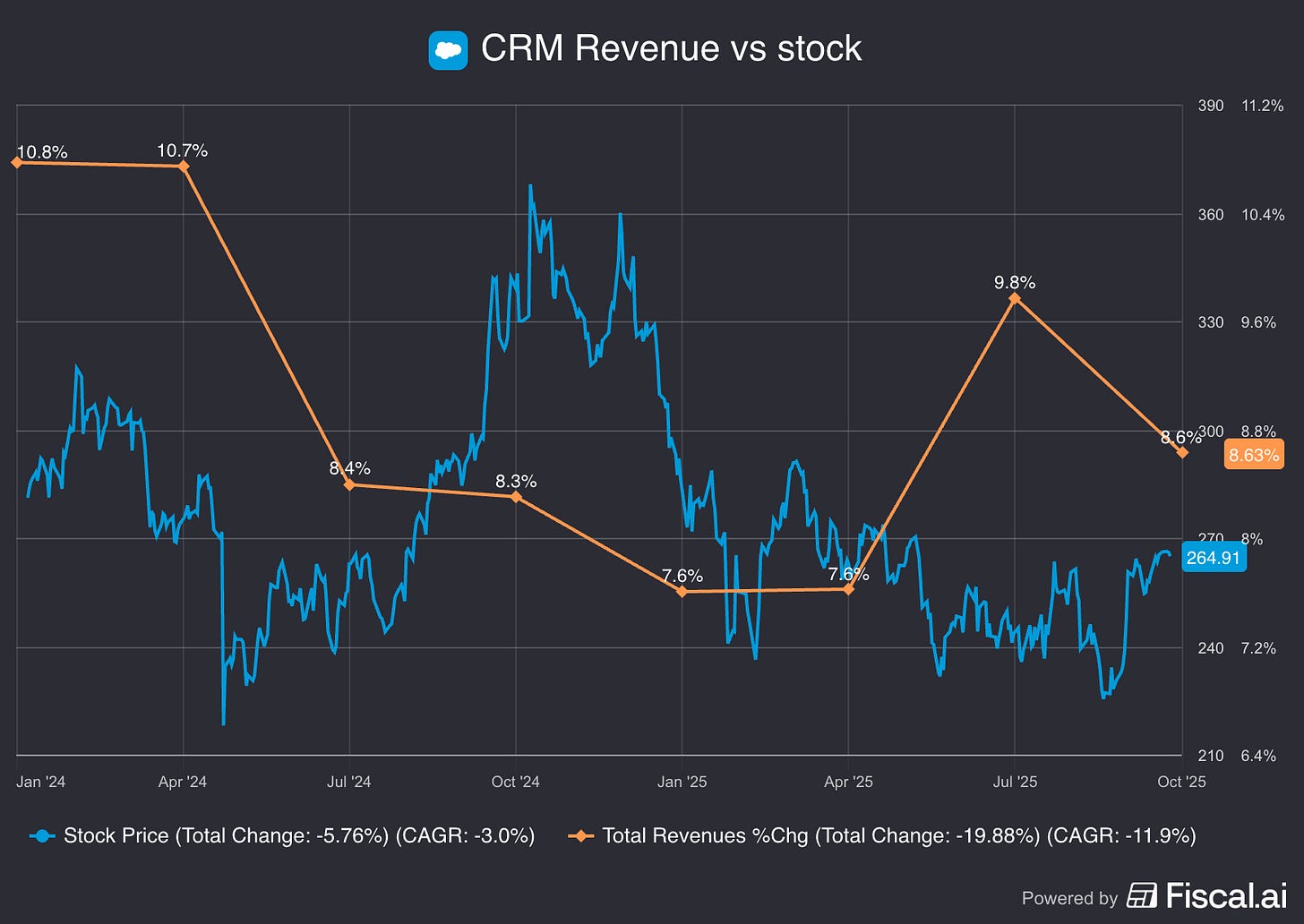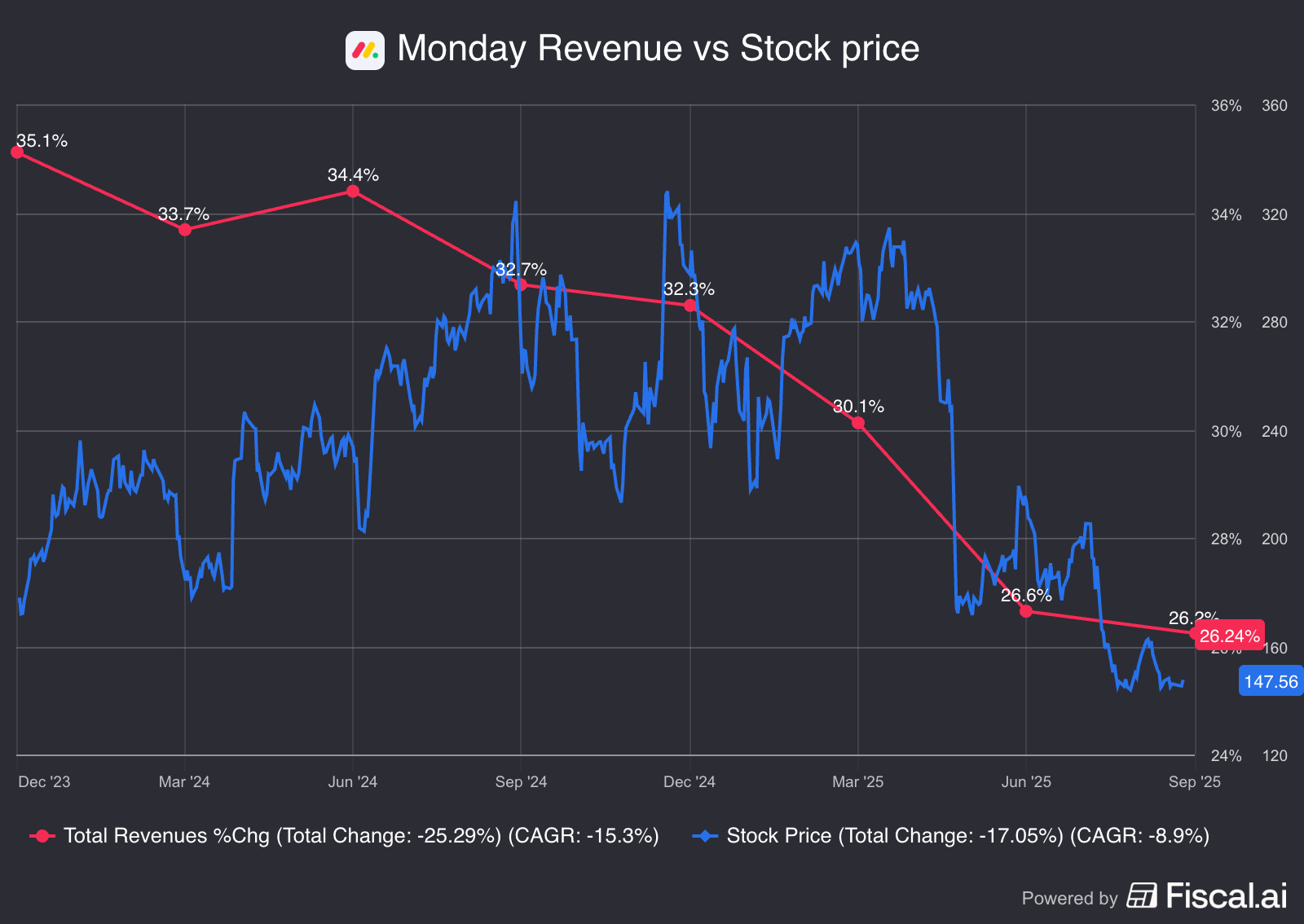 “SaaS is dead” has been a real trade in 2025. The drawdown started in 2024, but it accelerated as LLMs improved and investor attention and capital shifted toward an “AI Agents are going to eat the world” narratives. The tension is sharpest when you compare 2025 fundamentals vs. stock performance: companies can print respectable revenue and earnings growth and still see meaningful multiple compression.