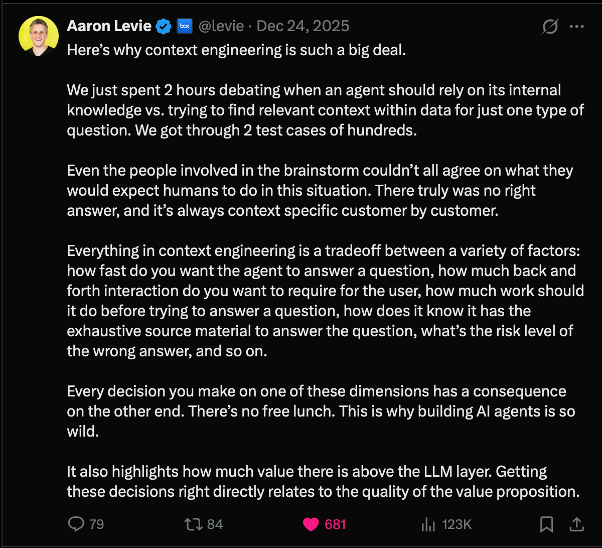 Connection to the real time data, whether via the web or internal tools are still not there. MCP was a step forward, but many companies are still working on their ‘agent focused’ APIs. How much context do you need to provide? What kind of context? Where is that context even stored? What’s the actual record that the SoR needs to expose? How many API calls will external agents be able to make before being limited?