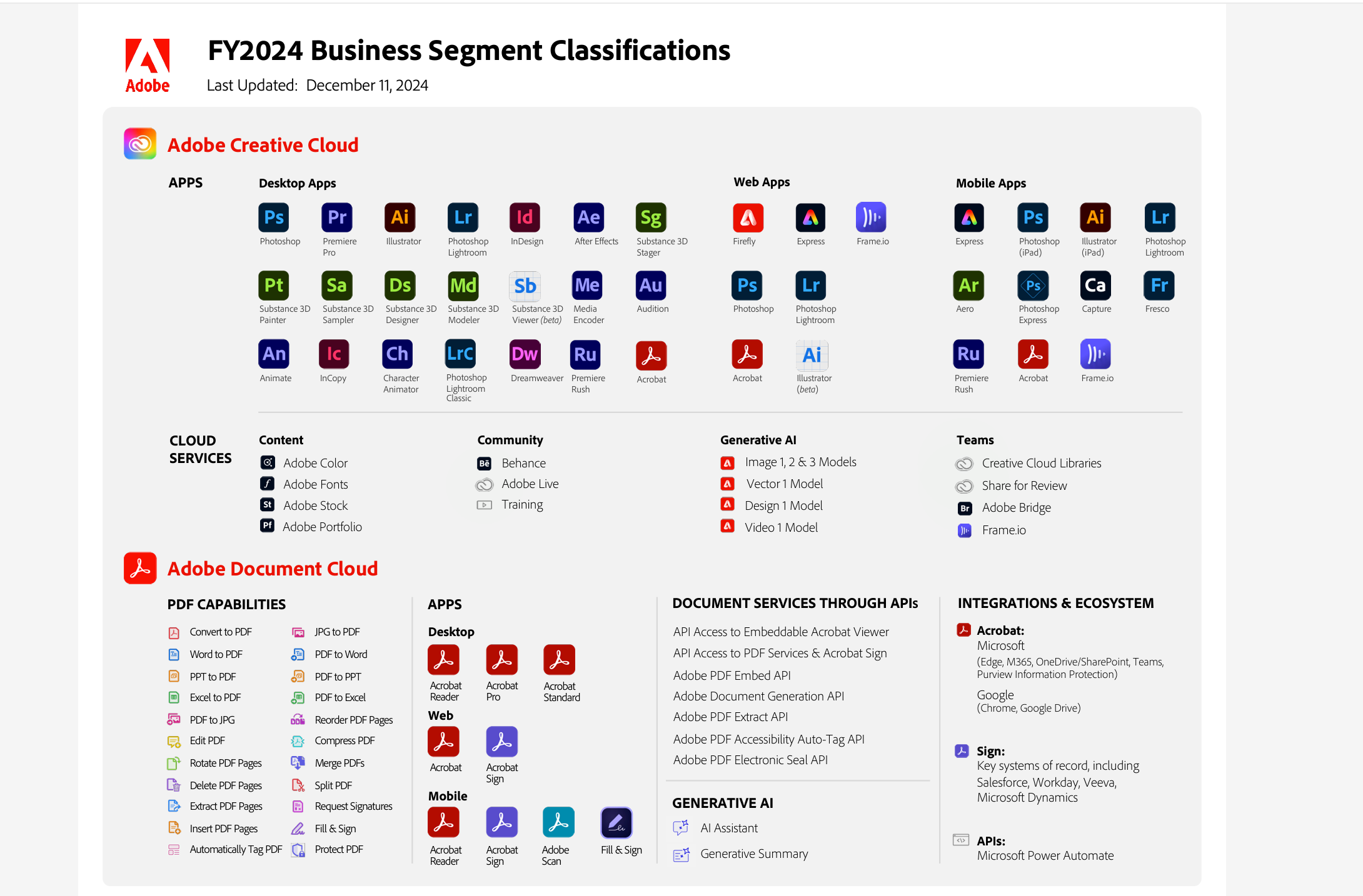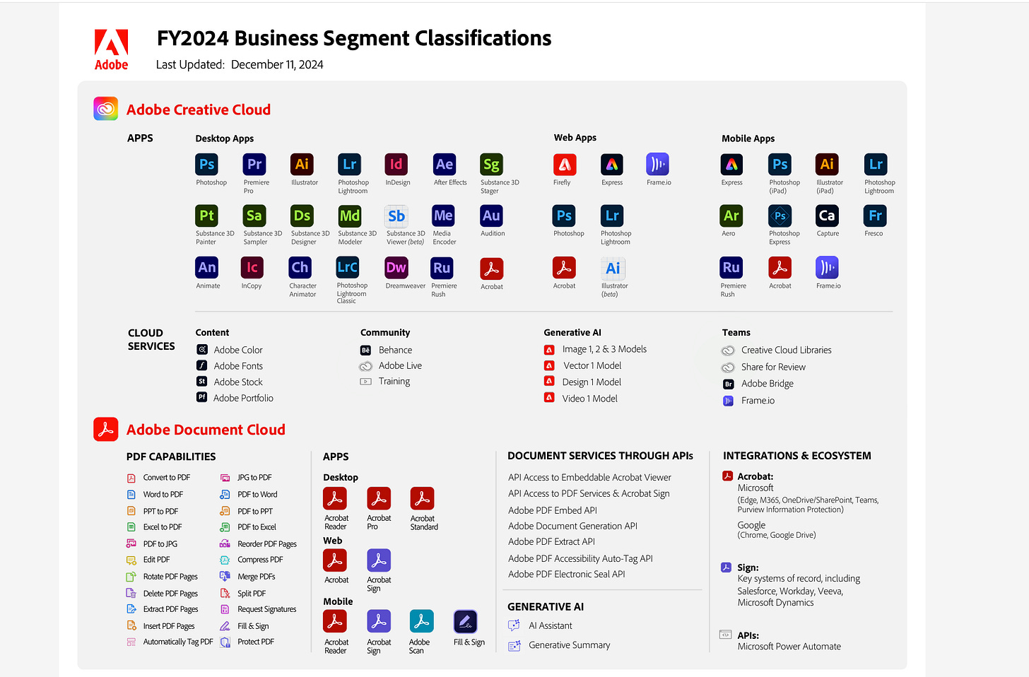 Adobe's revenue growth is derived from three main business segments: Creative Cloud (think Photoshop and Illustrator), Document Cloud (Acrobat Reader), and Digital Experience (Enterprise solution for marketing funnels). Each is a distinct business line with different dynamics. AI also plays a unique role in each business segment. What's common to all three has been the overall shift in revenue that Adobe has conduct over the past decade - shifting from product to subscription revenue.