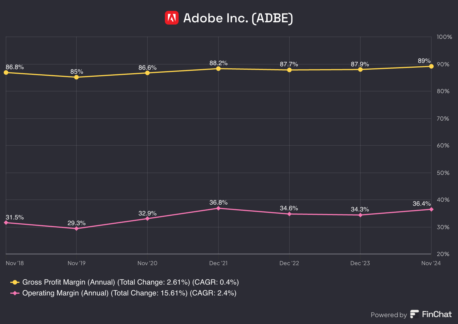 Adobe's financial engine is seriously impressive when you dig into the numbers. The 88% gross margins are very impressive. They've been maintaining these margins for a decade, which speaks to their pricing power, stickiness and business dynamics. Gross margins have reached maturity. There's no real room for improvement.