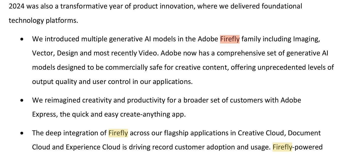 Adobe Firefly (which we'll be diving more into below) is Adobe's generative AI tool that plugs into their creative cloud. This has served as an excellent lead generation tool to bring in new users to Adobe's acquisition funnel, or at least it's mentioned in as much in several of Adobe's conference calls.