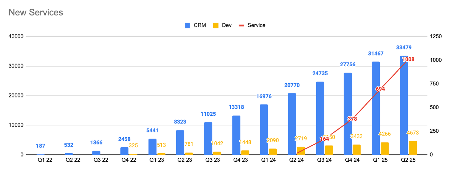 → This is growth mismatch number one. CRM, Service and Dev are for SME, not enterprise (yet), so one doesn't inform the other and growth velocity could therefore slow down and be a longer ramp. These are products aimed at strengthening the mid market segment. While analysts were expecting these products to be upsold quickly, welllll that's wrong. It'll take a bunch of years to replace Salesforce apparently.