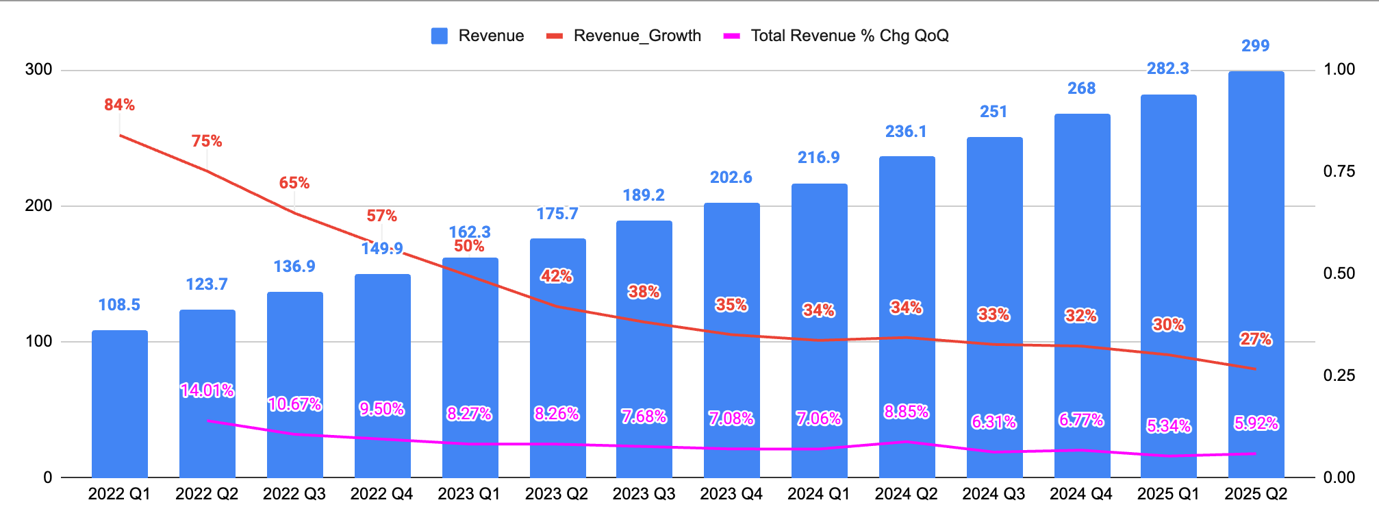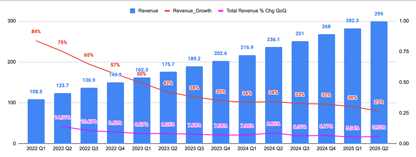 To put this into numbers, growth definitely decelerated - from 30% in Q1 to 27% in Q2. While that was above management guidance, analysts have been expecting more. Q1 guidance was for growth of 26.5%, and it came in at 30.5% a 300 bp beat. Q2 guidance was 2 percentage points lower, at 24.5%, and came in at 26.5% a 200 bp beat. Guidance was both lower and beat was smaller, leading to a 300 bp sequential deceleration.
